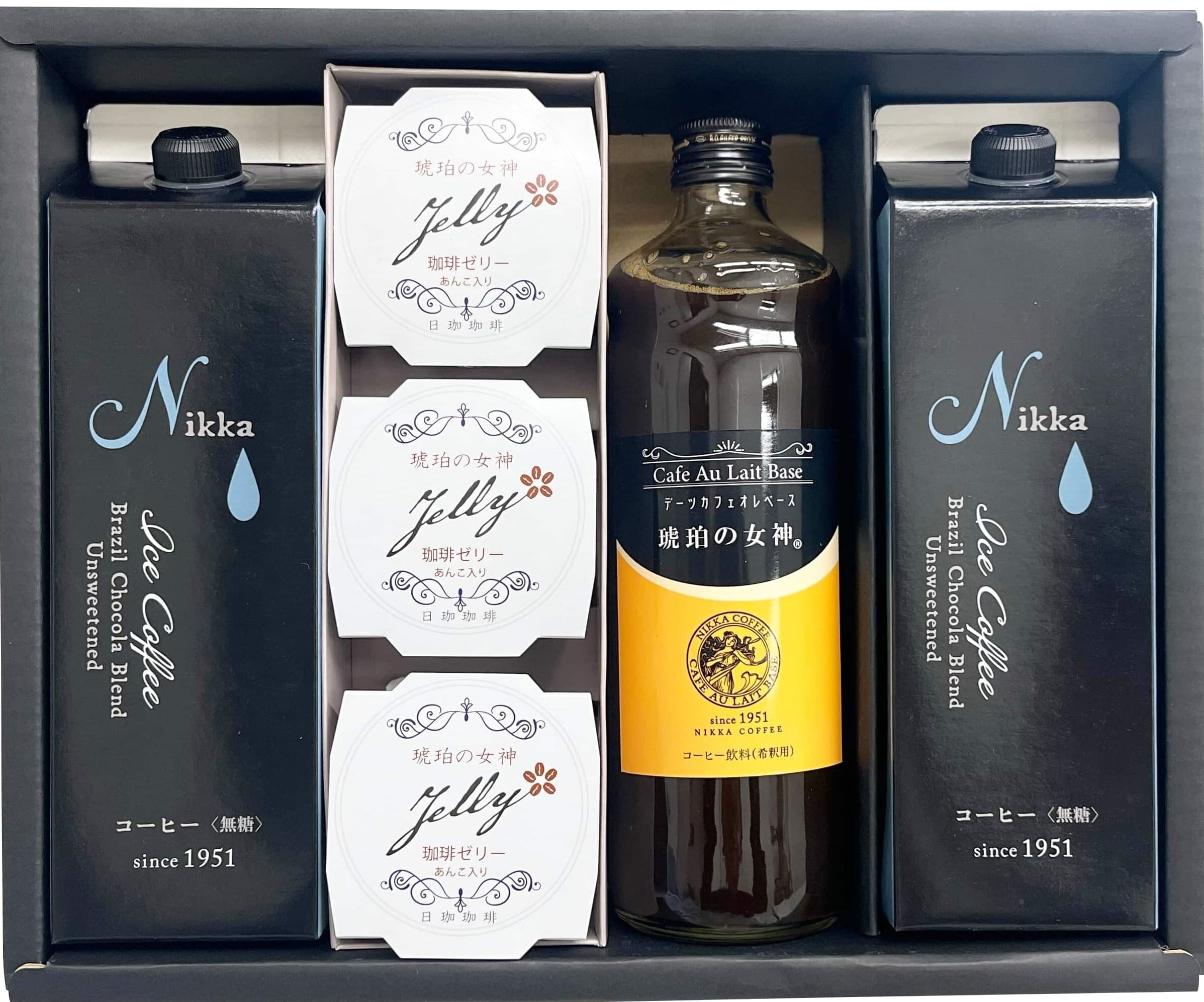 「老舗和菓子屋さん」の餡子と日珈のコーヒーで作った自慢のゼリーと「デーツ」で甘味をつけたカフェオレベース(牛乳等で4倍希釈) リキッドコーヒーのセットです。