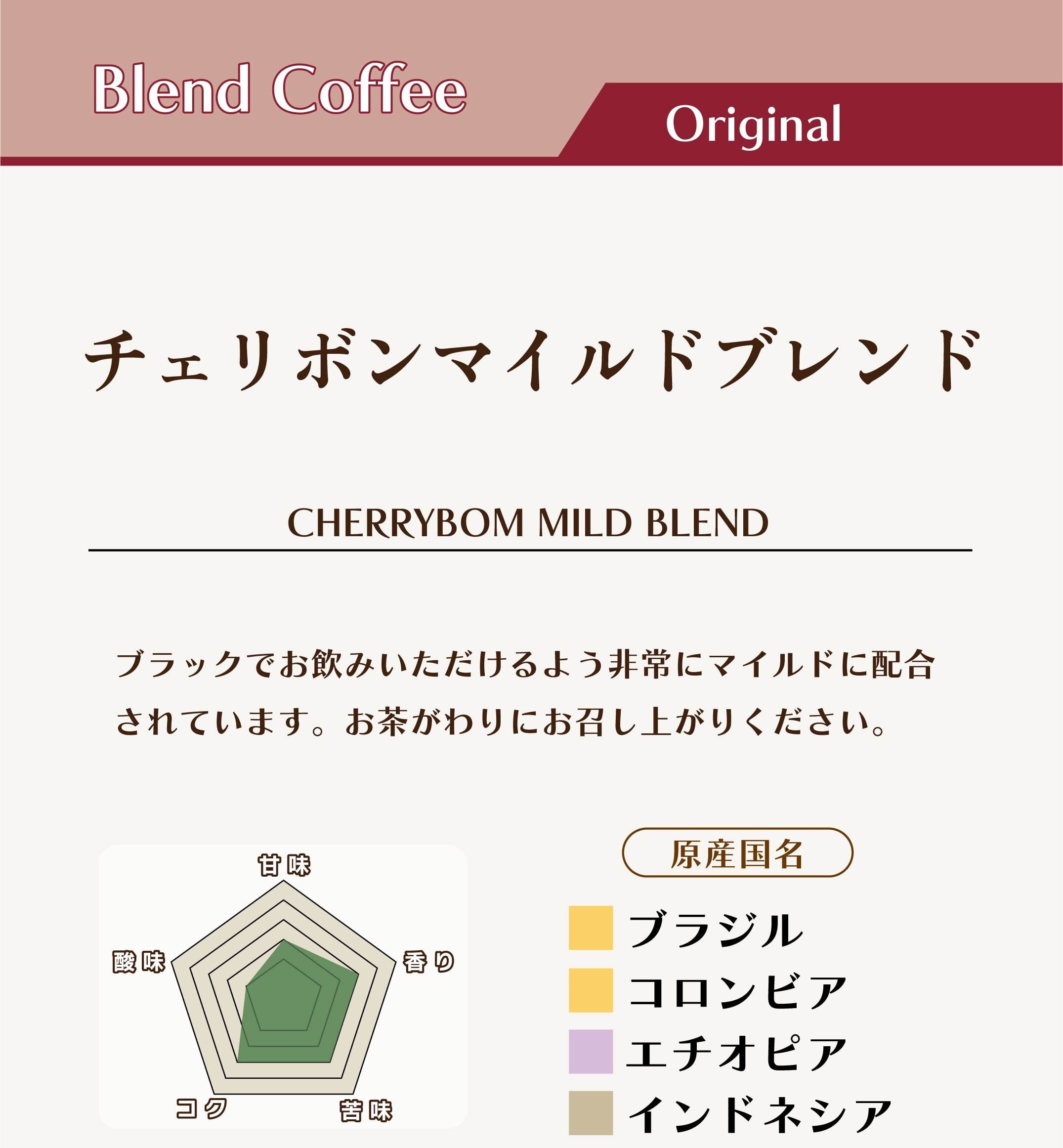 お茶がわりとしてブラックコーヒーでお飲みいただけるようマイルドな配合に仕上げました。